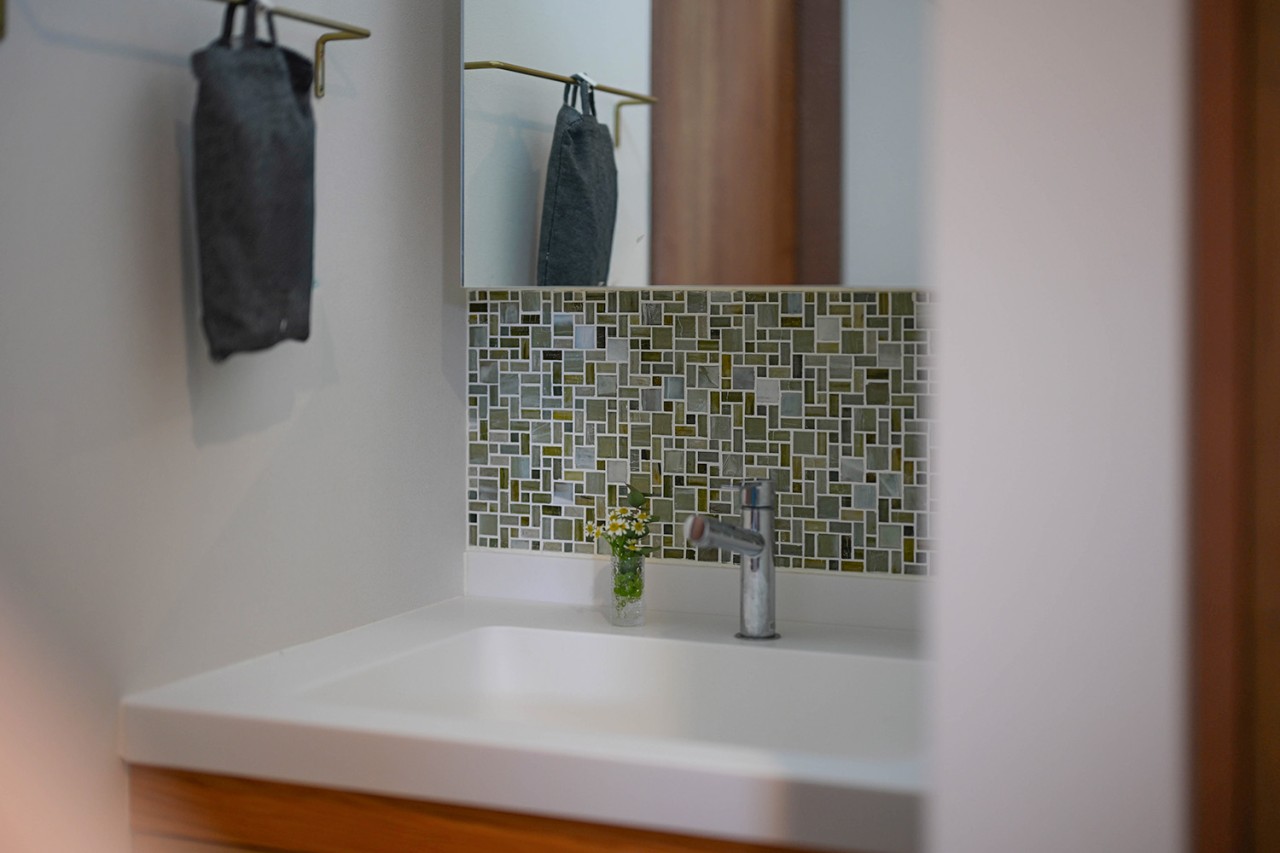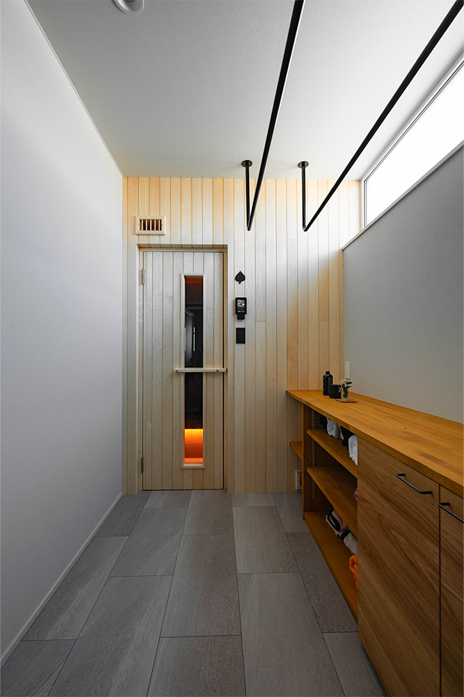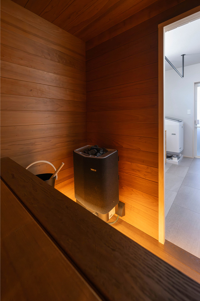 外観は白い塗装と板張りを組み合わせ、片流れ屋根ですっきりとしたフォルムにまとめました。内装は、白と木を基調にグレーをアクセントとして取り入れ、優しいトーンに。1階にはナラの無垢フロア、2階には幅広のパイン材を採用し、素材の表情を生かしています。Oさんのご要望であるドライサウナは、ベンチや間接照明も設え、自宅で本格的に楽しめる空間としました。
