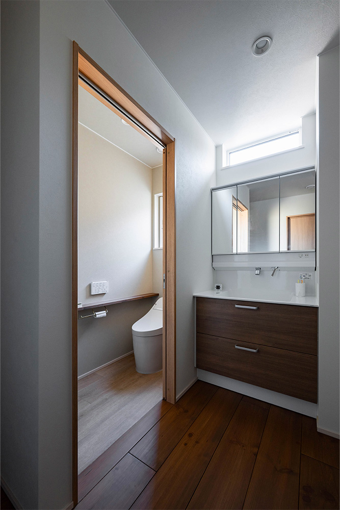計画の大きなポイントは、1階の家族が集まる空間を広く確保するため、水まわりを2階に集約した点。これにより、LDK+畳スペースで約24.5帖のゆとりある空間が実現しました。さらに、洗濯の作業を2階で完結させる動線とし、日々の家事効率に配慮しています。生活シーンを想像しながら適材適所に配置した収納も、暮らしやすさを高めています。