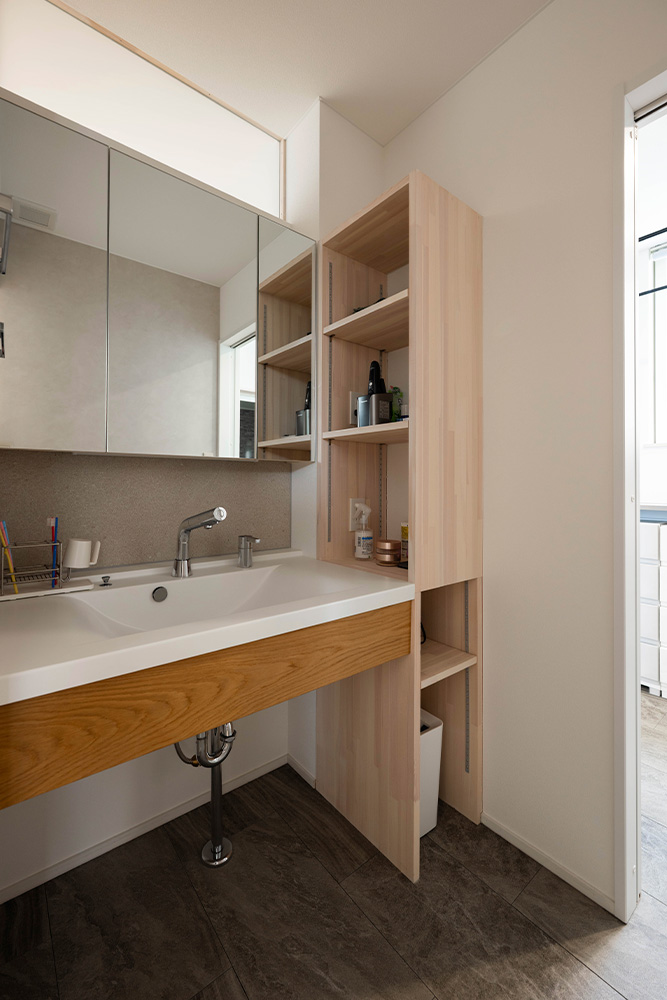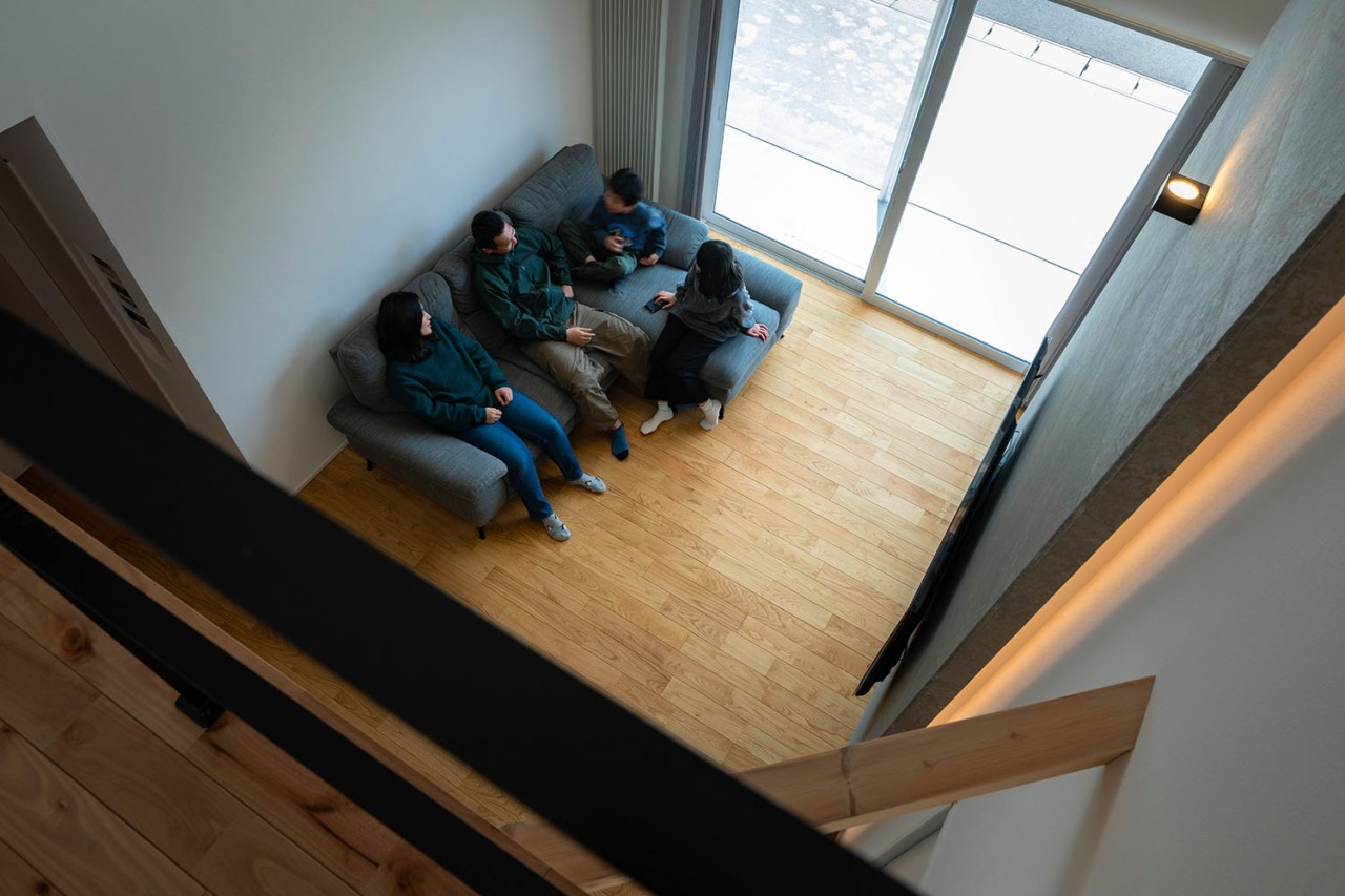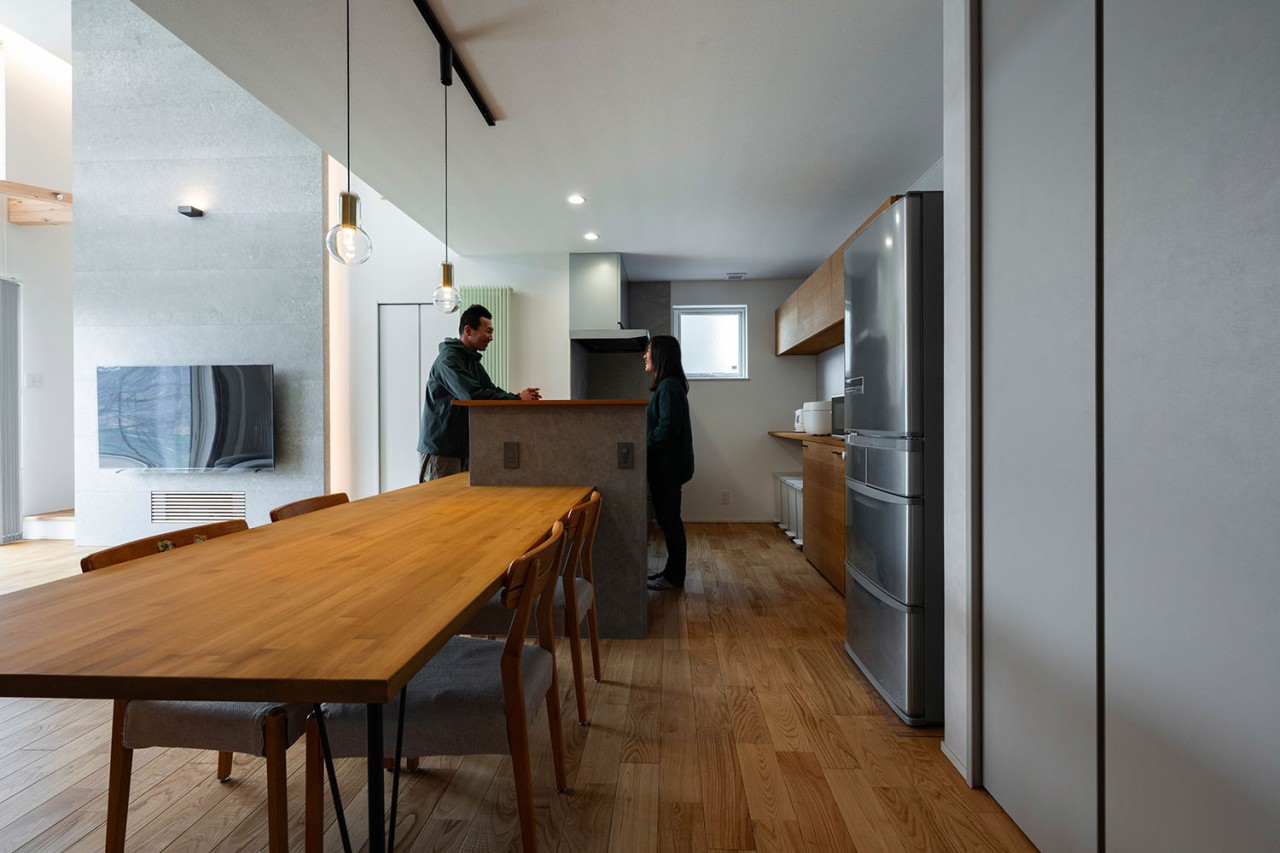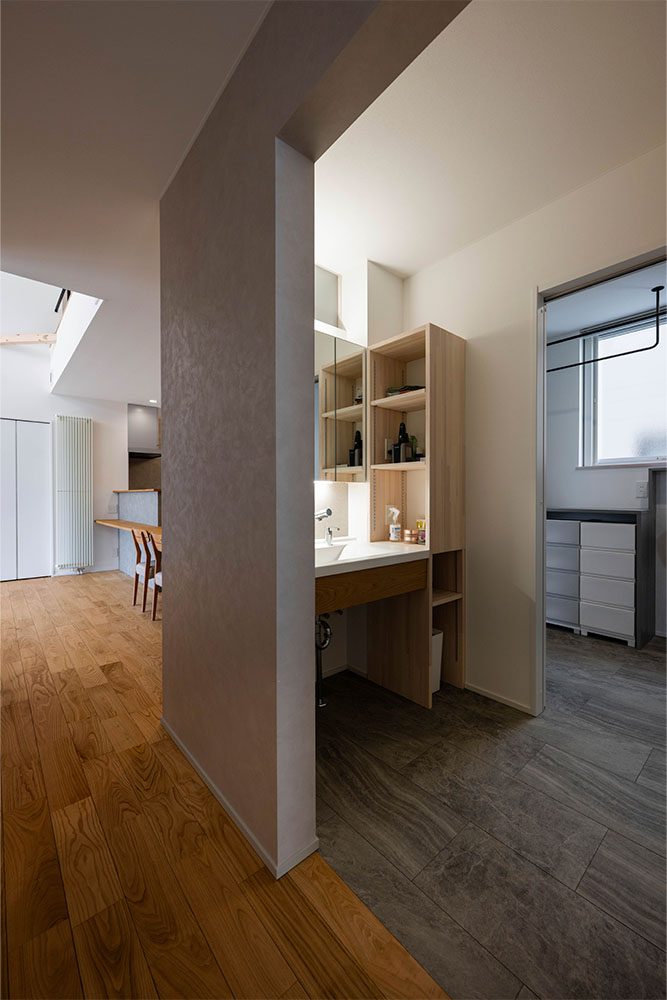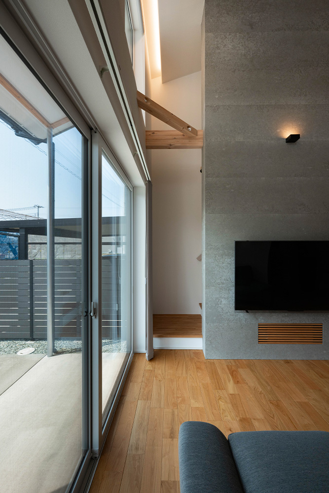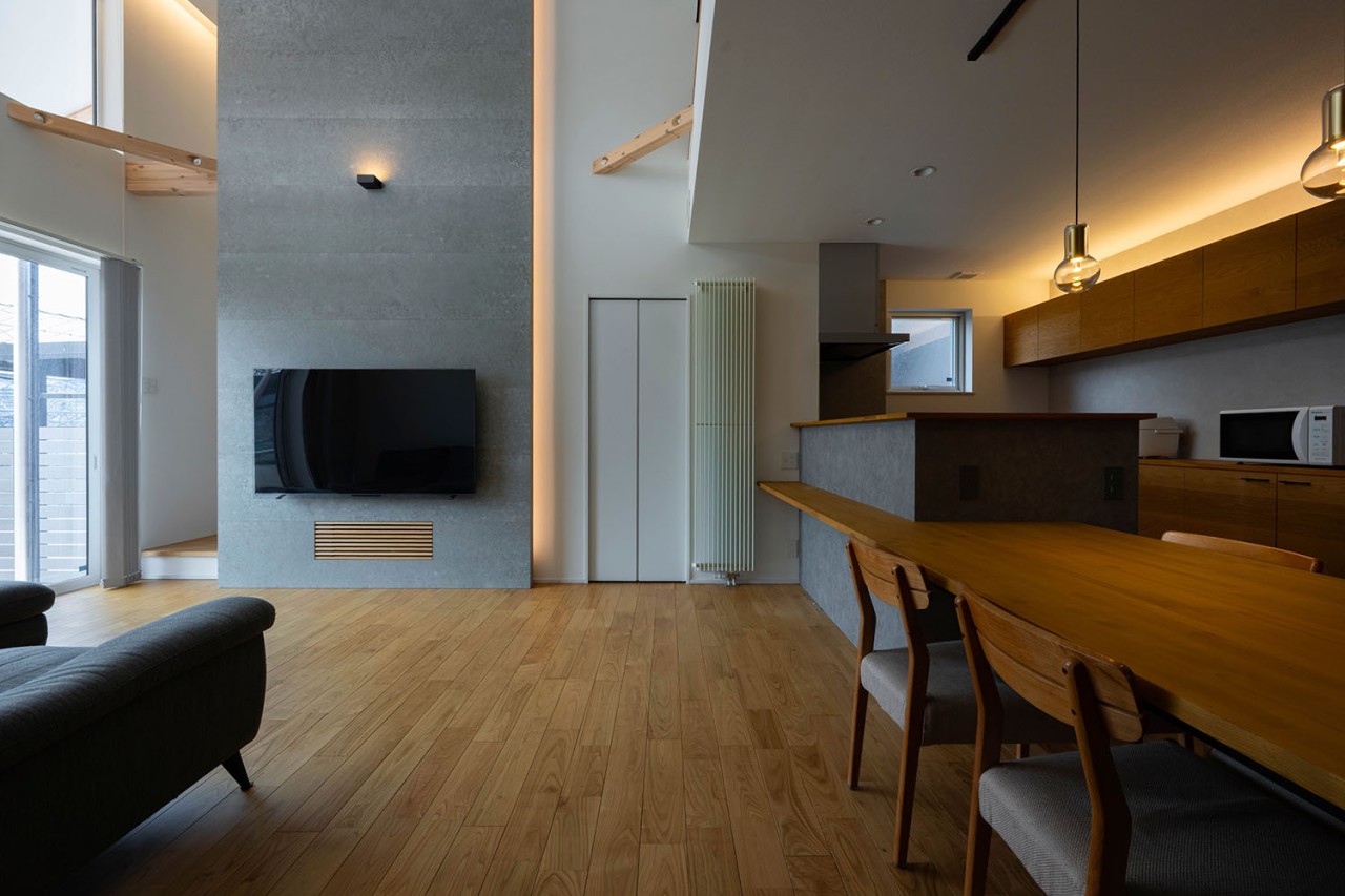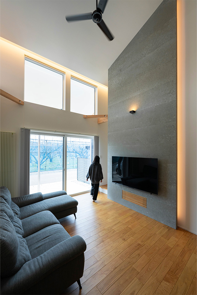 性能面では、高断熱・高気密施工によりUA値0.35、C値0.3を実現。暖房にはパネルヒーター、冷房にはエアコンを採用し、第1種換気と組み合わせることで、外気の影響に左右されない安定した室内環境をかなえています。内装は白、グレー、木を基調とし、無垢材やセメントの質感を生かした壁材「SOLIDO」を織り交ぜてコーディネート。快適性・機能性・デザイン性を兼ね備えた、四季を通じて心地よく暮らせる住まいが完成しました。