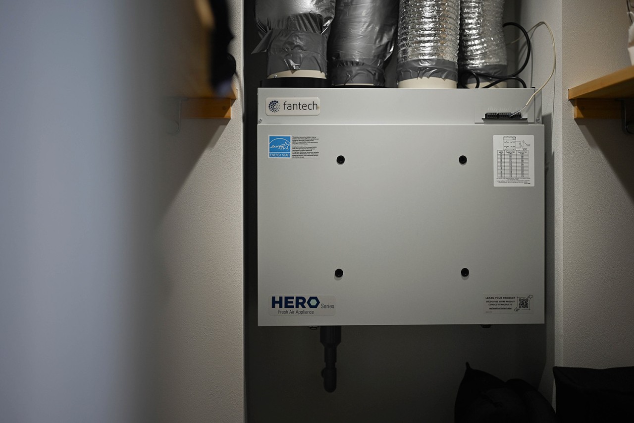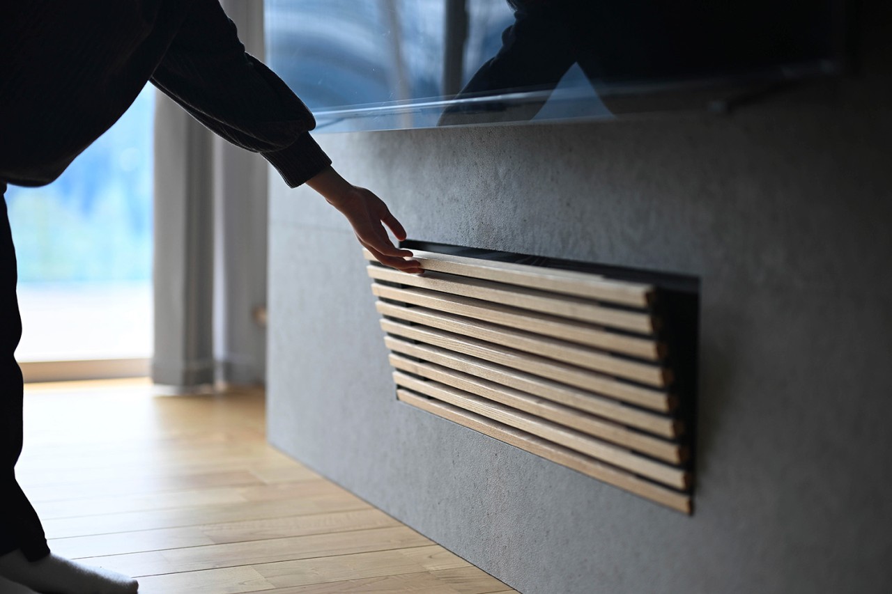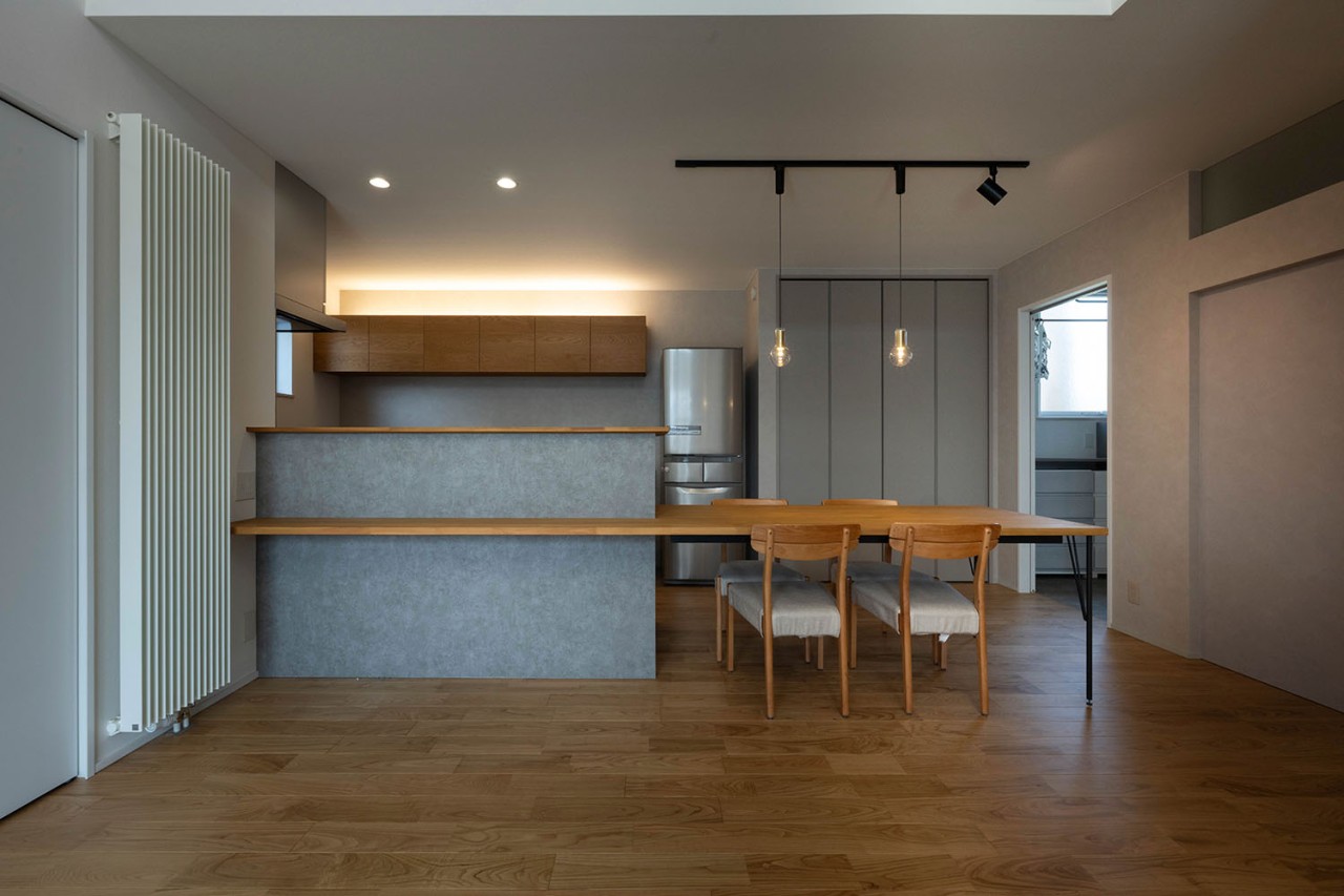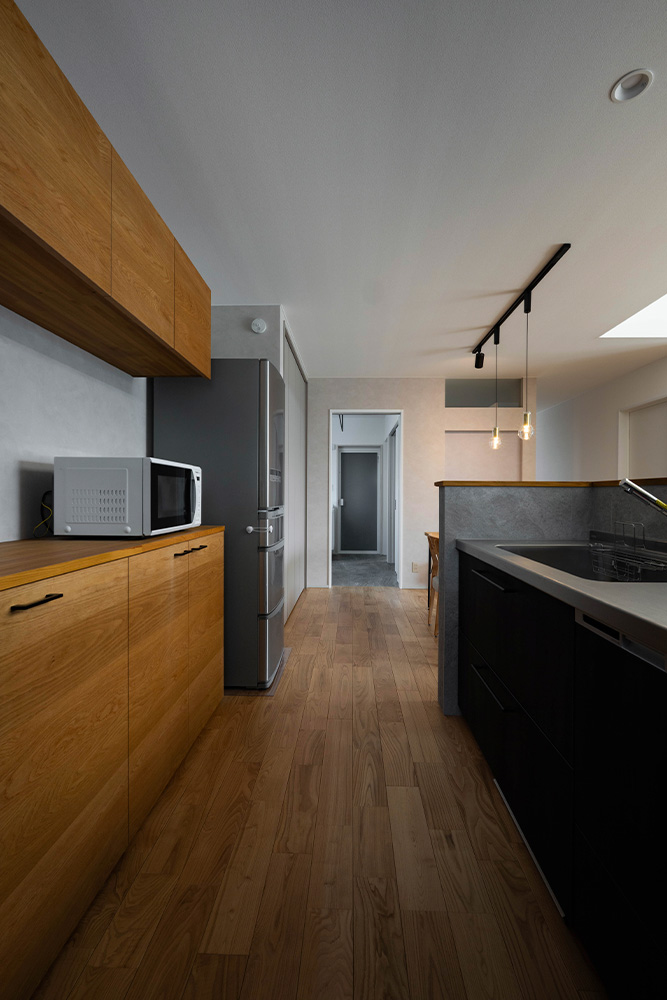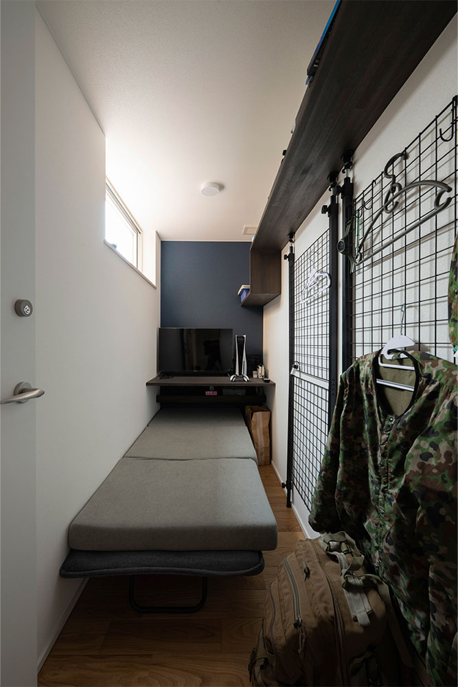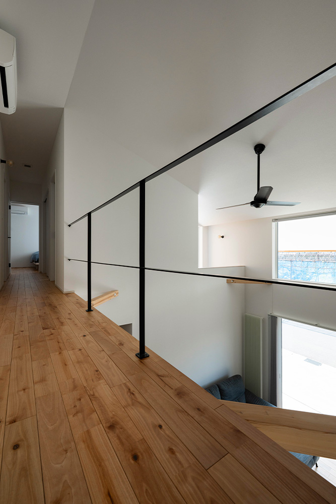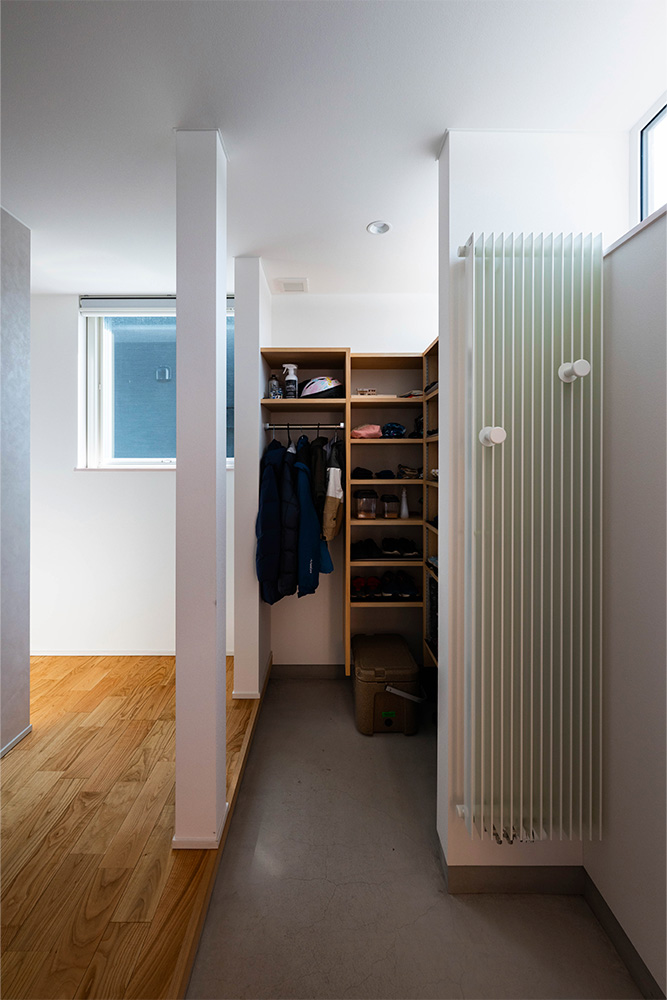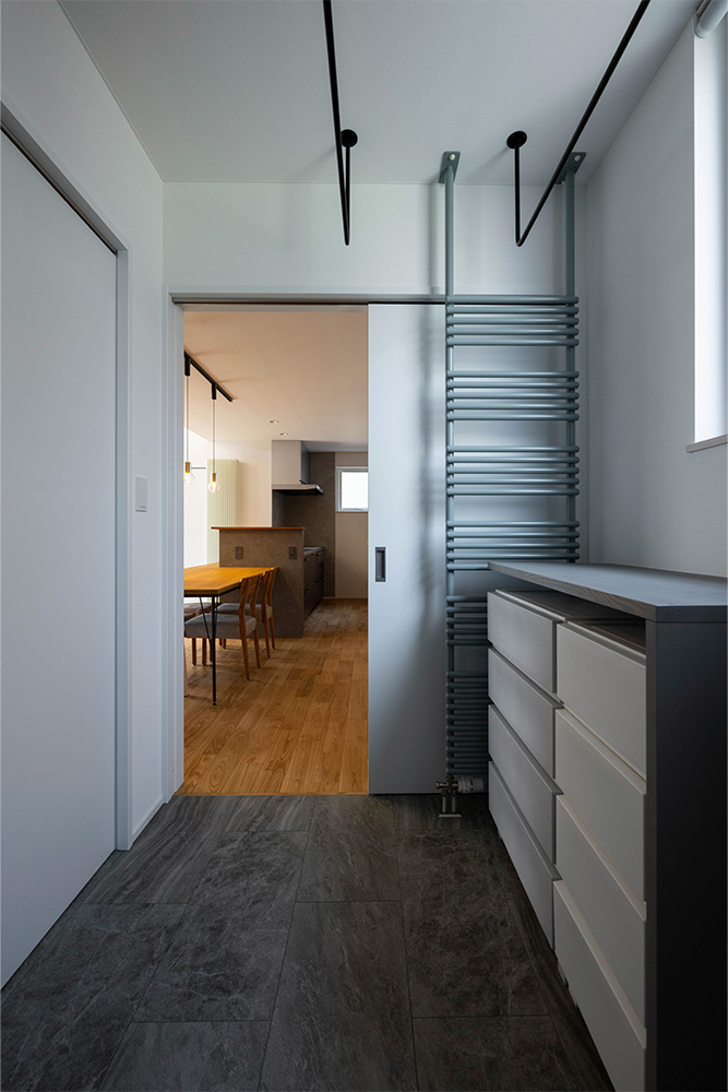 性能面では、高断熱・高気密施工によりUA値0.35、C値0.3を実現。暖房にはパネルヒーター、冷房にはエアコンを採用し、第1種換気と組み合わせることで、外気の影響に左右されない安定した室内環境をかなえています。内装は白、グレー、木を基調とし、無垢材やセメントの質感を生かした壁材「SOLIDO」を織り交ぜてコーディネート。快適性・機能性・デザイン性を兼ね備えた、四季を通じて心地よく暮らせる住まいが完成しました。