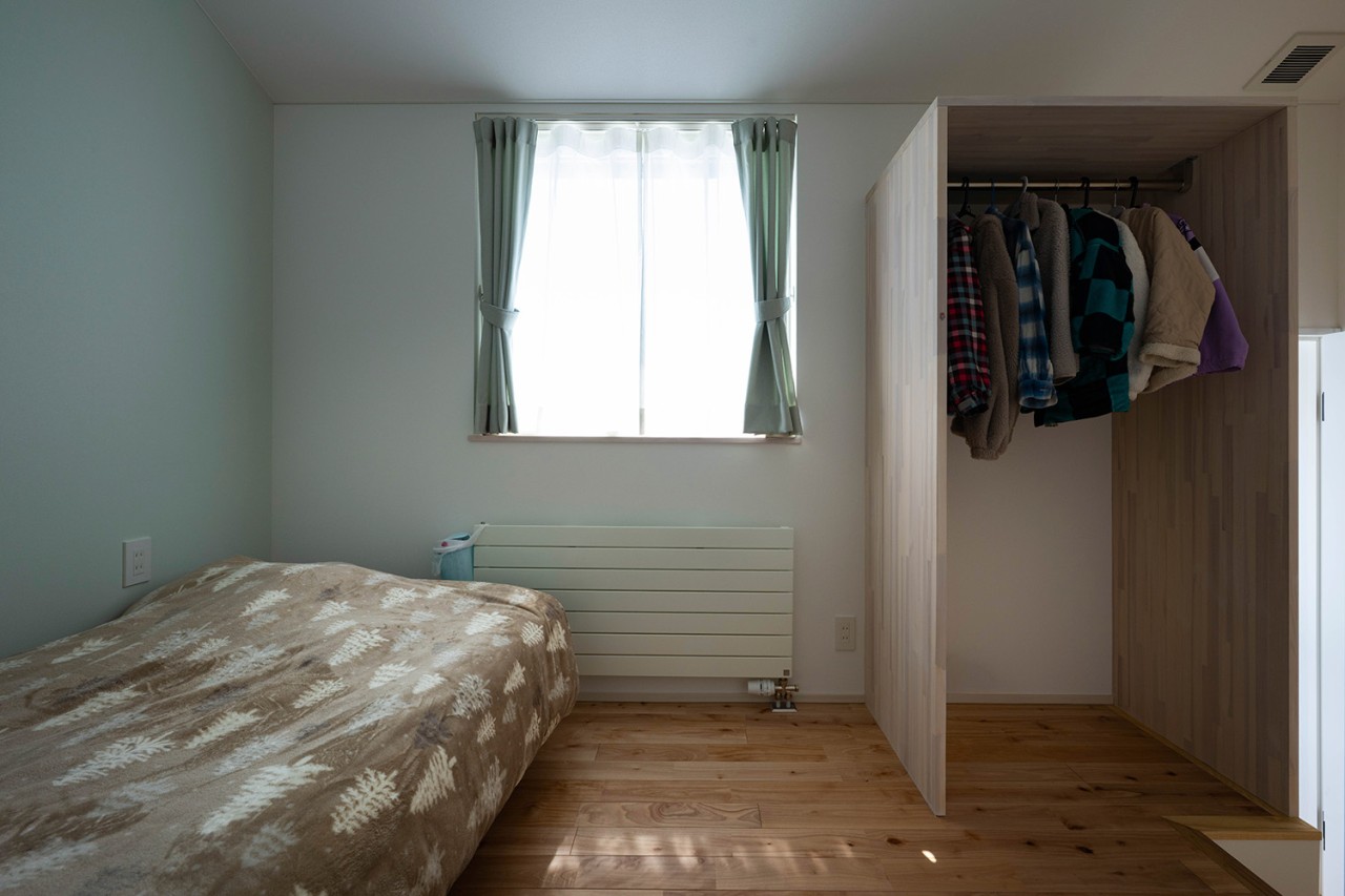 南面にさくらんぼ畑が広がるTさん宅。ファサードに用いたカラマツの荒々しい表情が魅力的な住まいです。家族が集うリビングは、大きな吹き抜けと高窓、勾配天井により、明るく開放的に。大開口も設け、景色と一体感のある居心地のよい空間としました。家事動線にも工夫を施しており、玄関からユーティリティ、キッチンへのスムーズな動線を確保。さらに、ユーティリティには回遊動線を取り入れ、洗濯から収納までを一連の流れで行えるよう計画しました。用途に応じた使い分けを考慮し、大容量のファミリークロークを3ヵ所に分散配置しているのも特徴的です。このほか、お子さんたちの個室やTさんの書斎など、それぞれの居場所もしっかり盛り込みました。